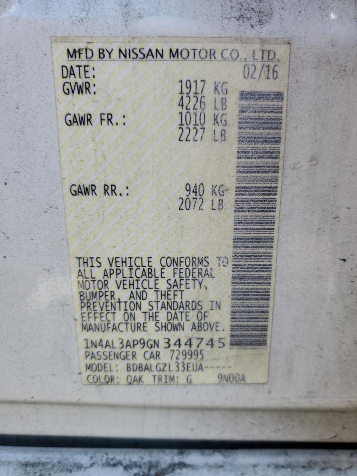 Колір БілийЦиліндри 4VIN 1N4AL3AP9GN344745Стан НевідомоУшкодження Передня або задня