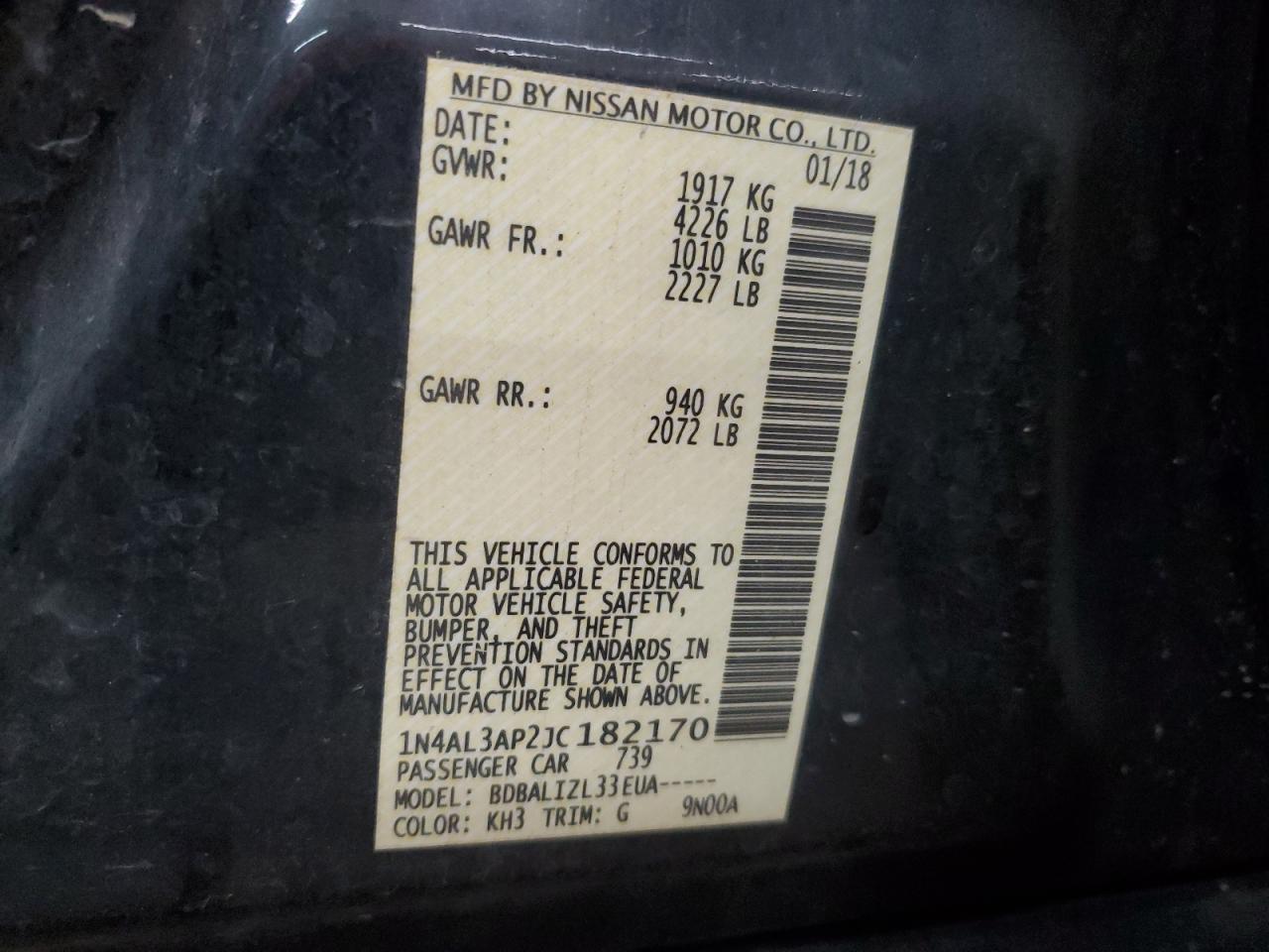 Колір ЧорнийЦиліндри 4VIN 1N4AL3AP2JC182170Стан Заводиться та їде (перевірено)Ушкодження Передня або задняДата аукціону 2025-11-18