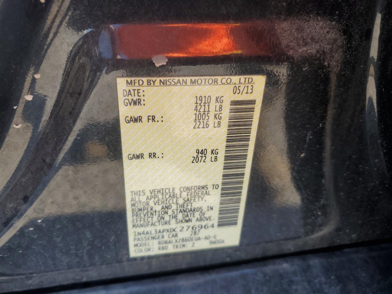 Колір СірийЦиліндри 4VIN 1N4AL3APXDC276964Стан Заводиться та їде (перевірено)Ушкодження Передня або задня