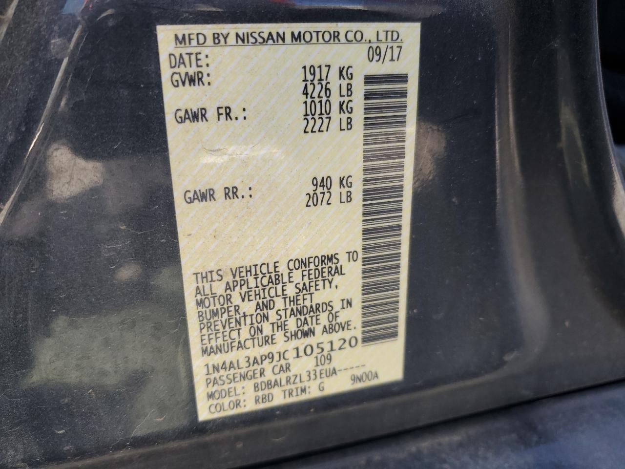 Колір ЧорнийЦиліндри 4VIN 1N4AL3AP9JC105120Стан Заводиться та їде (перевірено)Ушкодження Передня або задня