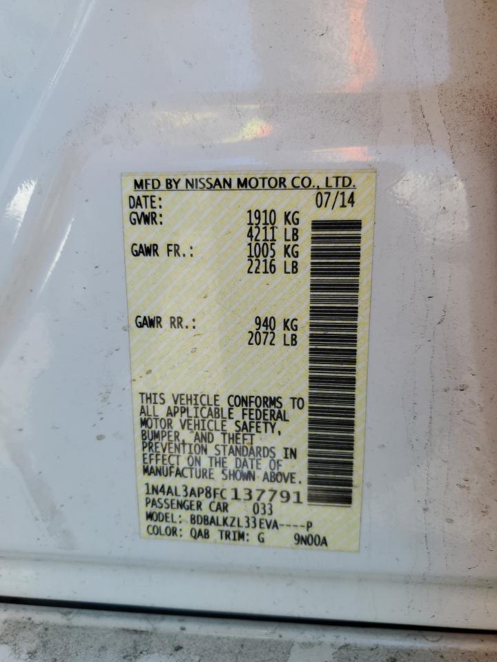 Колір БілийЦиліндри 4VIN 1N4AL3AP8FC137791Стан НевідомоУшкодження Передня або задня