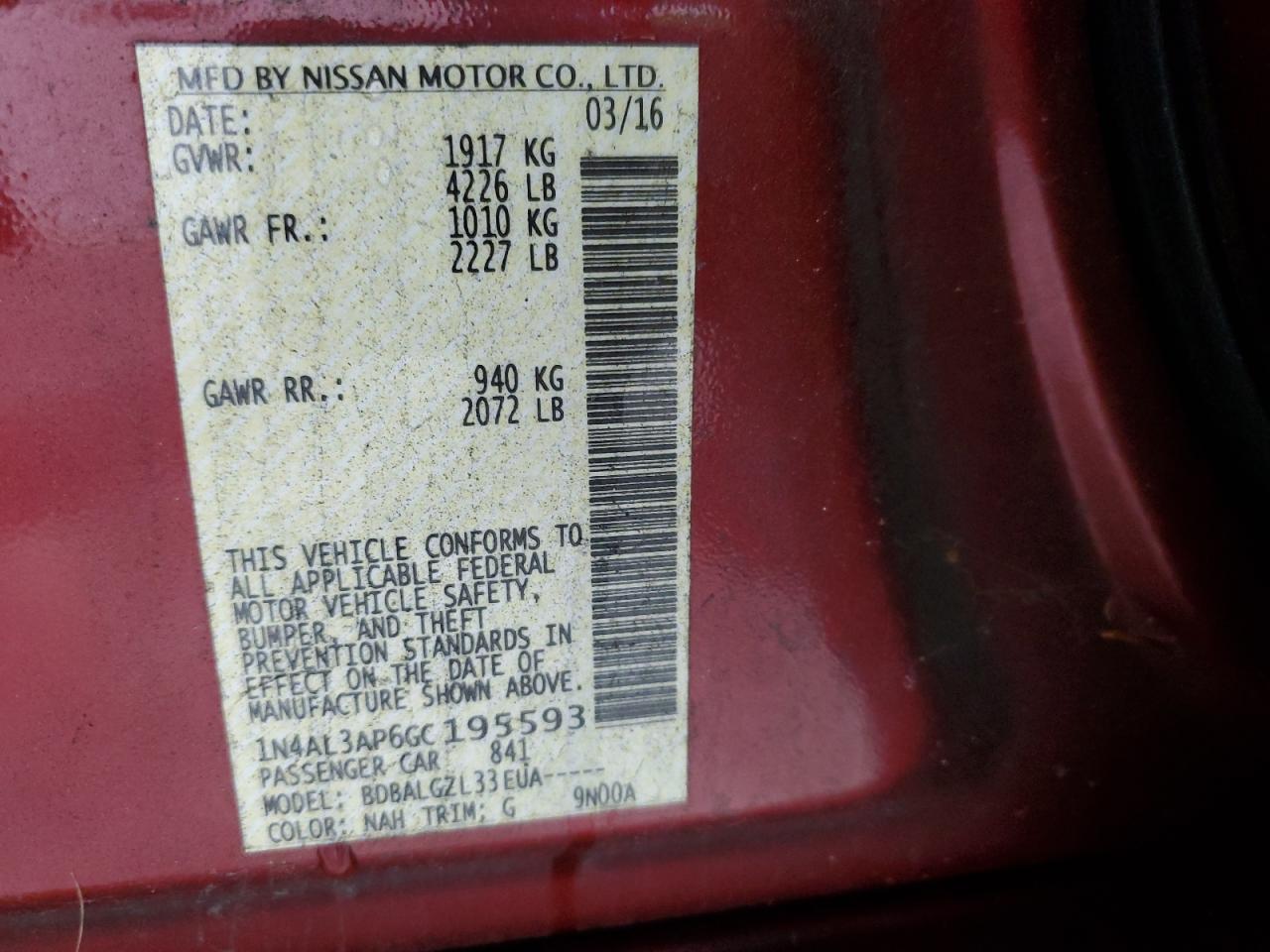 Колір ЧервонийЦиліндри 4VIN 1N4AL3AP6GC195593Стан ЗаводитьсяУшкодження Передня або задня