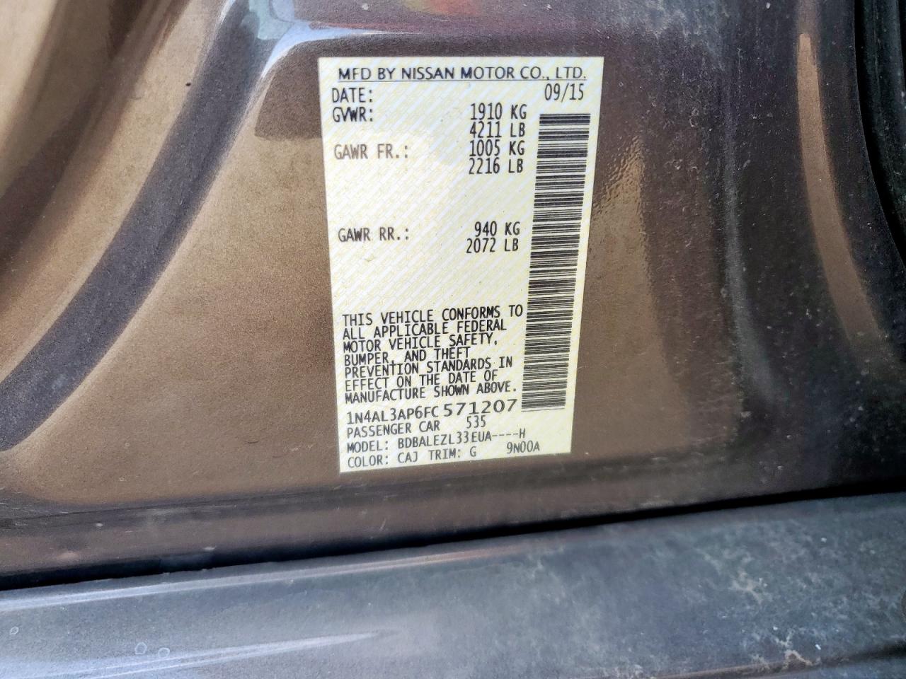 Колір Деревне вугілляЦиліндри 4VIN 1N4AL3AP6FC571207Стан НевідомоУшкодження Передня або задня
