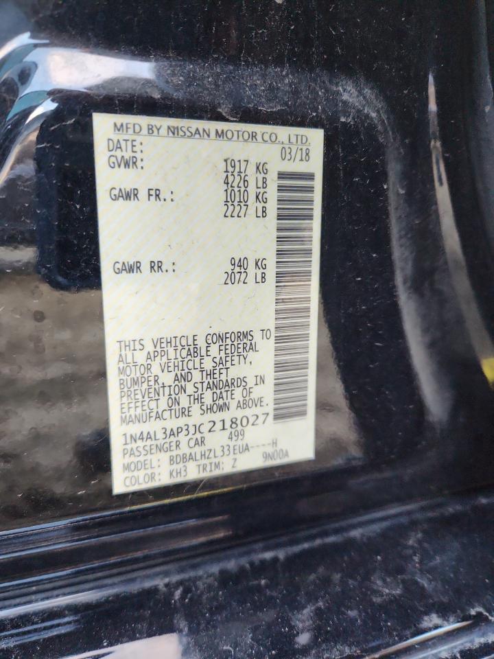 Колір ЧорнийЦиліндри 4VIN 1N4AL3AP3JC218027Стан ЗаводитьсяУшкодження Передня або задня