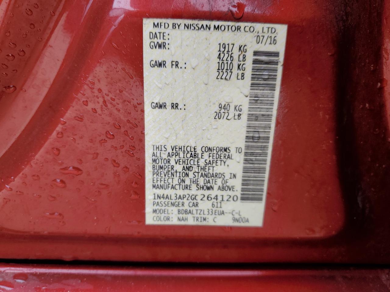 Колір БургундіяЦиліндри 4VIN 1N4AL3AP2GC264120Стан Заводиться та їде (перевірено)Ушкодження Задня