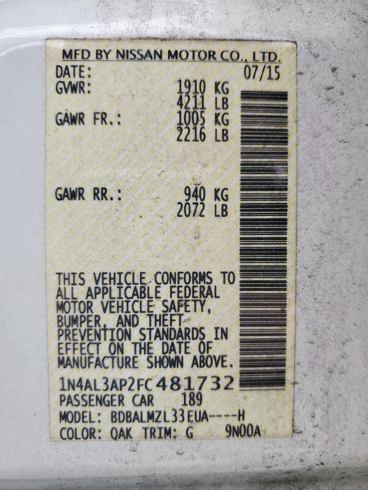 Колір БілийЦиліндри 4VIN 1N4AL3AP2FC481732Стан Заводиться та їде (перевірено)Ушкодження Передня або задня