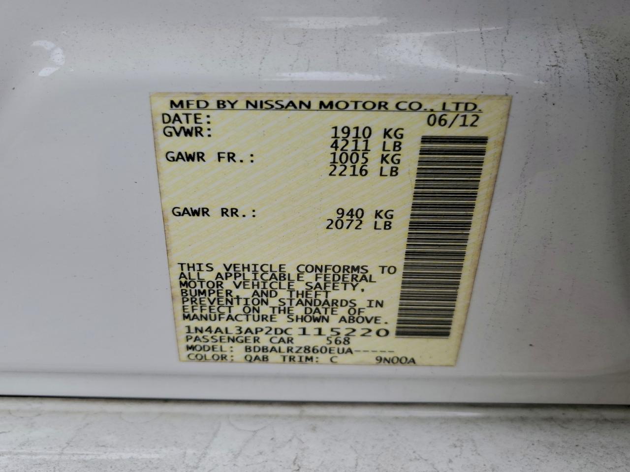 Колір БілийЦиліндри 4VIN 1N4AL3AP2DC115220Стан Заводиться та їде (перевірено)Ушкодження Передня або задня