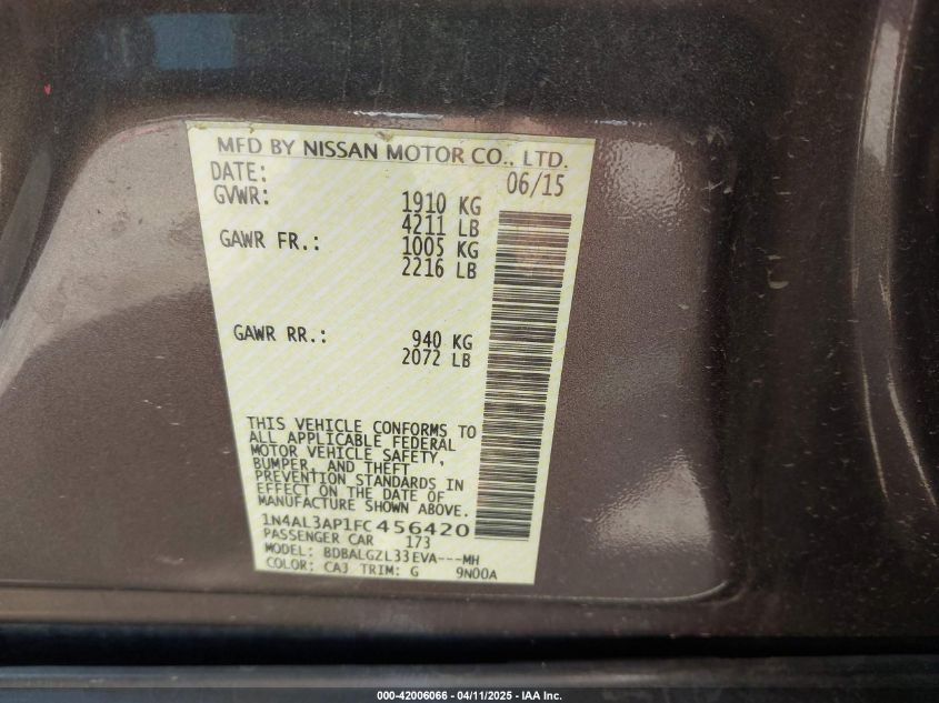 NISSAN ALTIMA 2.5 2015 р.в., Передній привід (1N4AL3AP1FC456420) з США