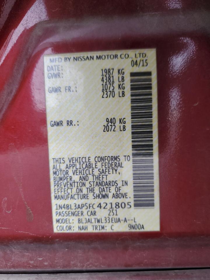 Колір ЧервонийЦиліндри 6VIN 1N4BL3AP5FC421805Стан Заводиться та їде (перевірено)Ушкодження Передня або задня