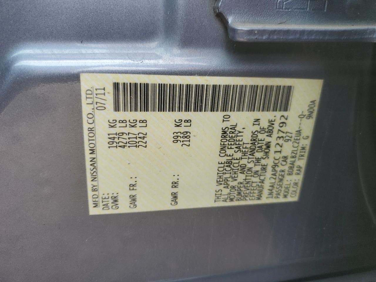 Колір СірийЦиліндри 4VIN 1N4AL2AP9CC123792Стан Заводиться та їде (перевірено)Ушкодження Передня або задня