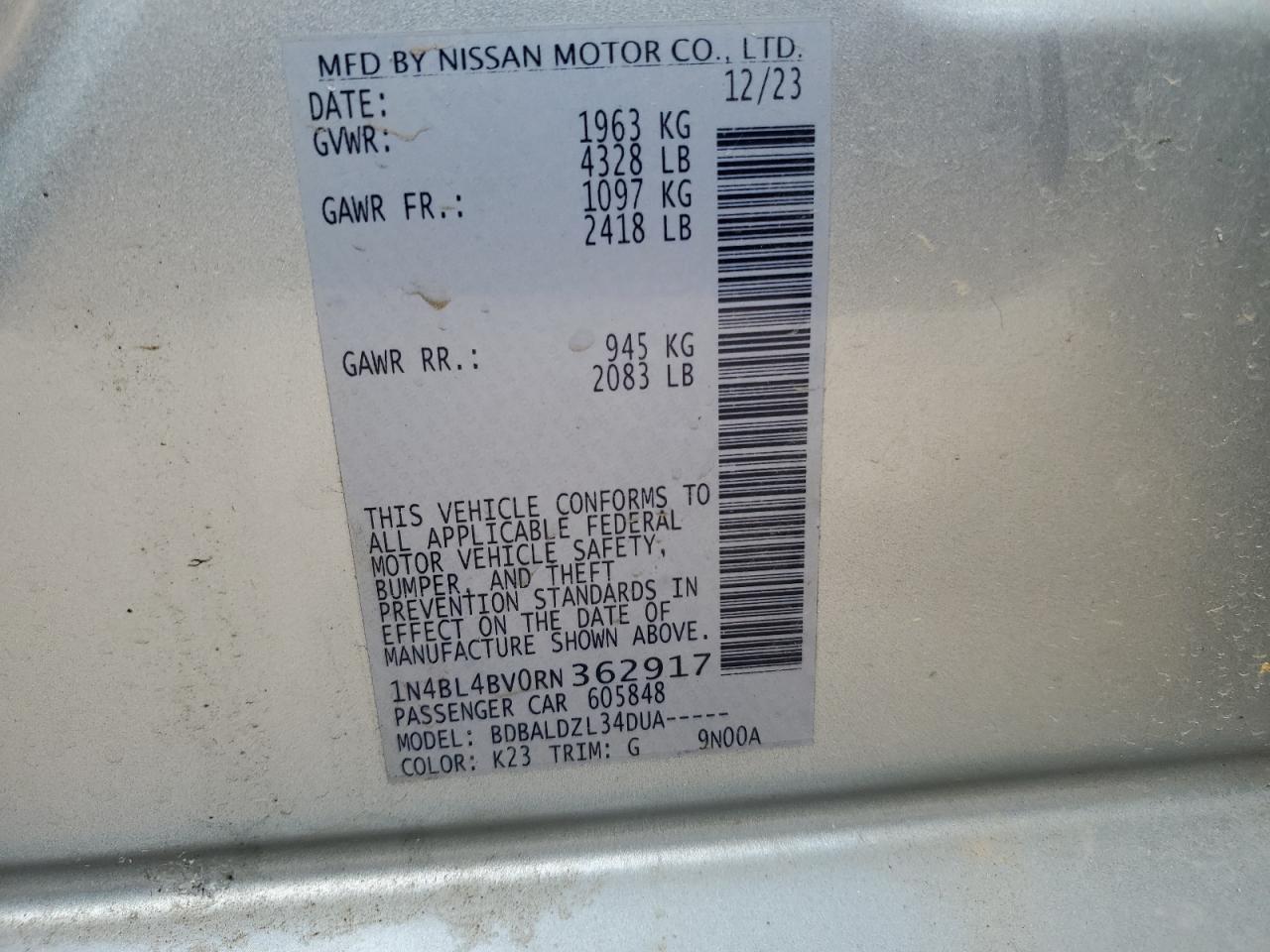 NISSAN ALTIMA 2.5 2024 р.в., (1N4BL4BV0RN362917) з США