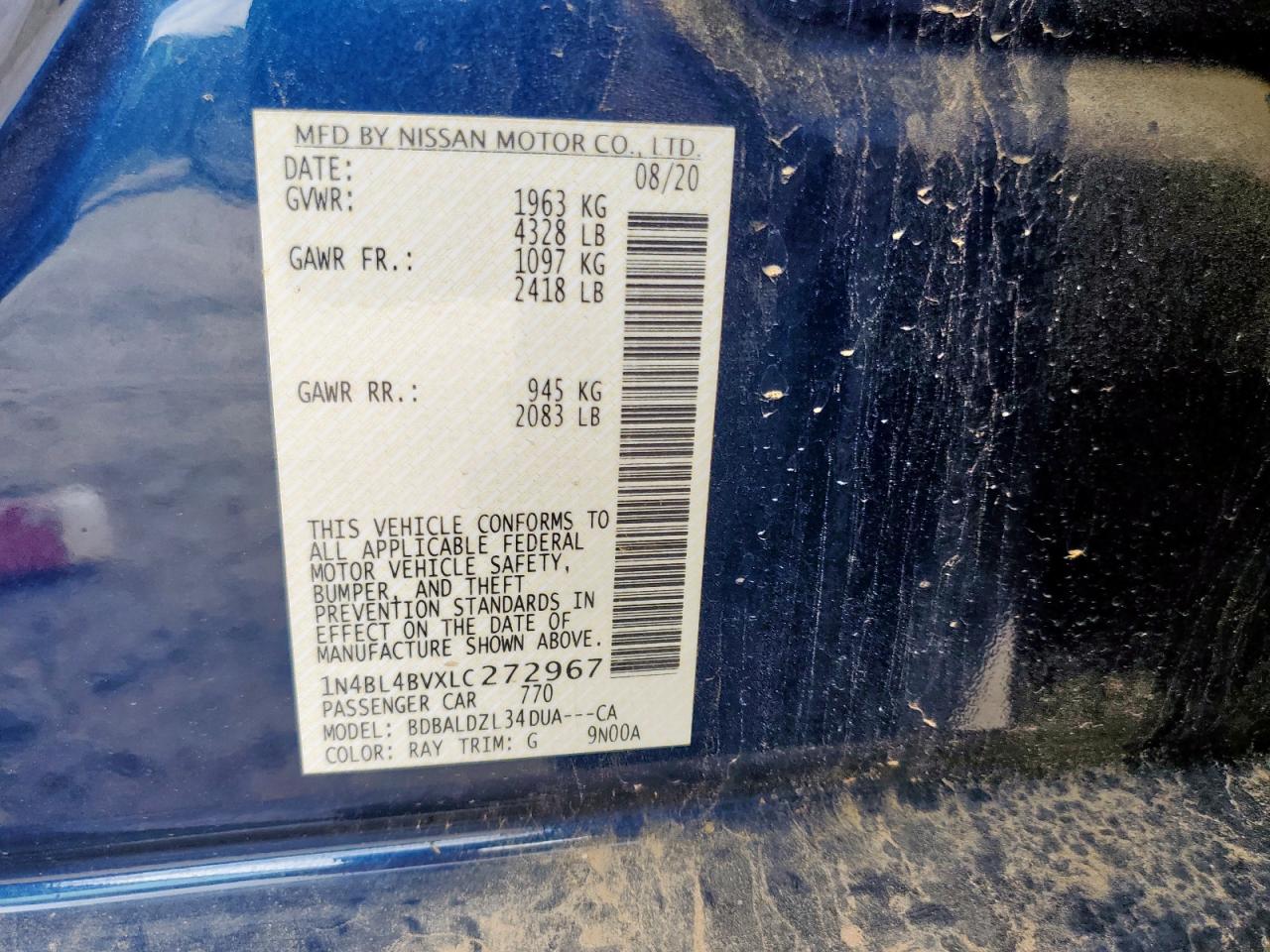 Колір СинійЦиліндри 4VIN 1N4BL4BVXLC272967Стан Заводиться та їде (перевірено)Ушкодження Звичайний зносДата аукціону 2025-11-18