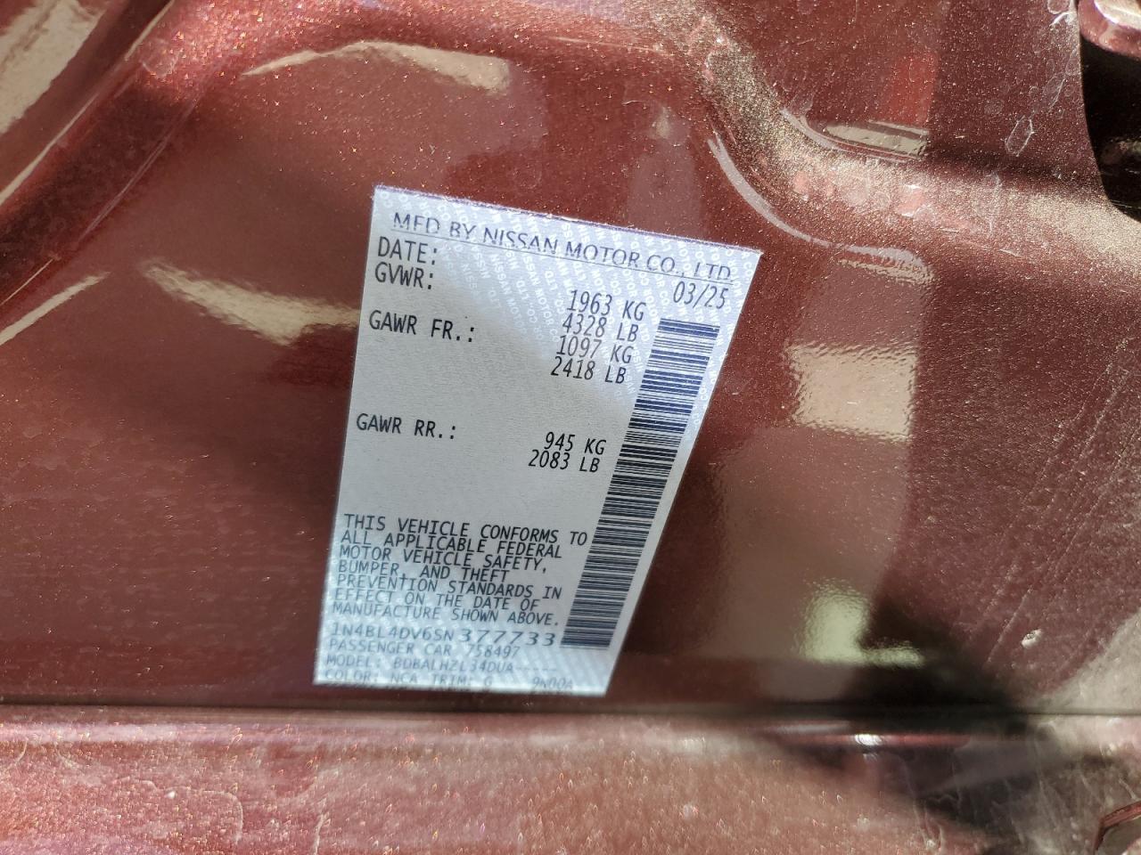 Колір БургундіяЦиліндри 4VIN 1N4BL4DV6SN377733Стан Заводиться та їде (перевірено)Ушкодження ЗадняДата аукціону 2025-11-03