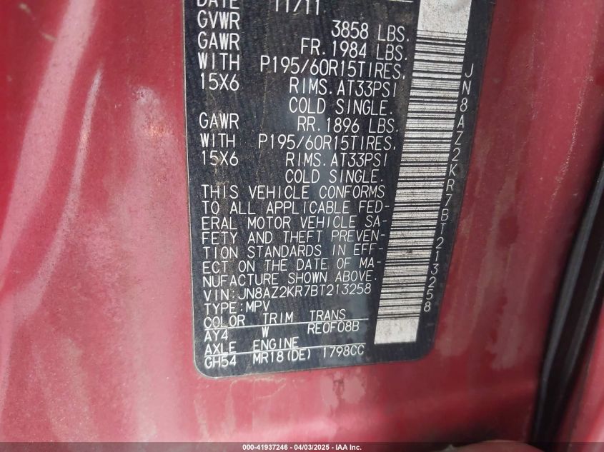 Колір ЧервонийЦиліндри 4Привід Передній привідVIN JN8AZ2KR7BT213258Стан Заводиться та їде (перевірено)Ушкодження Ліва сторона