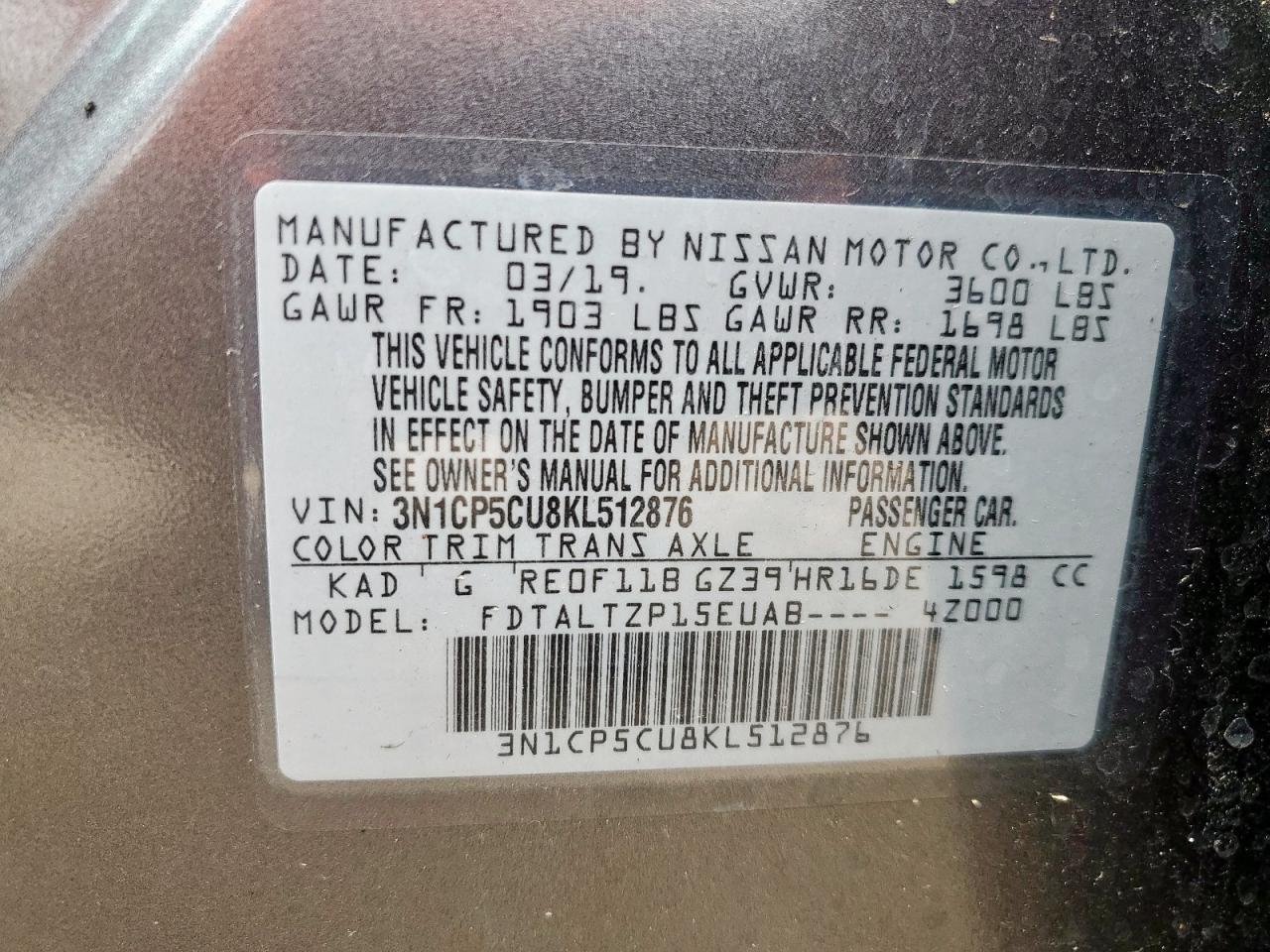 Колір СірийЦиліндри 4VIN 3N1CP5CU8KL512876Стан НевідомоУшкодження Пожежа