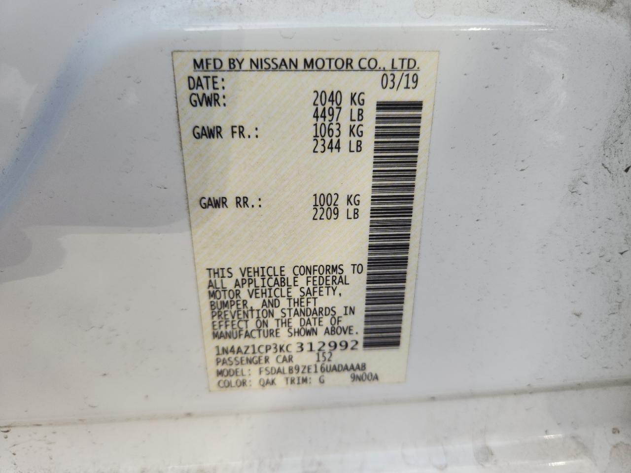 NISSAN LEAF U 2019 р.в., (1N4AZ1CP3KC312992) з США