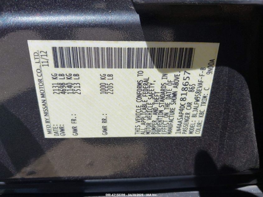 NISSAN MAXIMA 3.5 2013 р.в., Передній привід (1N4AA5AP4DC818657) з США