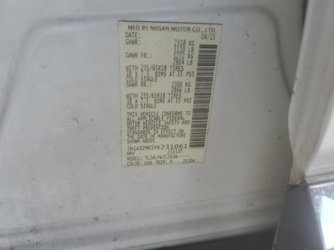 Колір БілийЦиліндри 6VIN 5N1AZ2MG5FN231061Стан Заводиться та їде (перевірено)Ушкодження Передня або задня