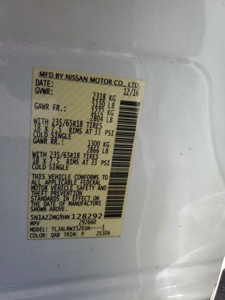 Колір БілийЦиліндри 6VIN 5N1AZ2MG9HN128292Стан ЗаводитьсяУшкодження Передня або задня