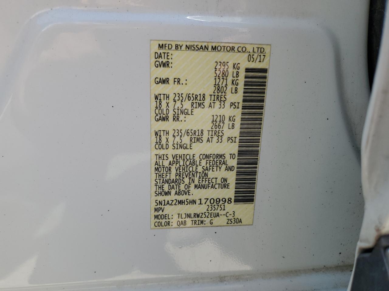 Колір БілийЦиліндри 6Привід Повний привідVIN 5N1AZ2MH5HN170998Стан Заводиться та їде (перевірено)Ушкодження Передня або задня