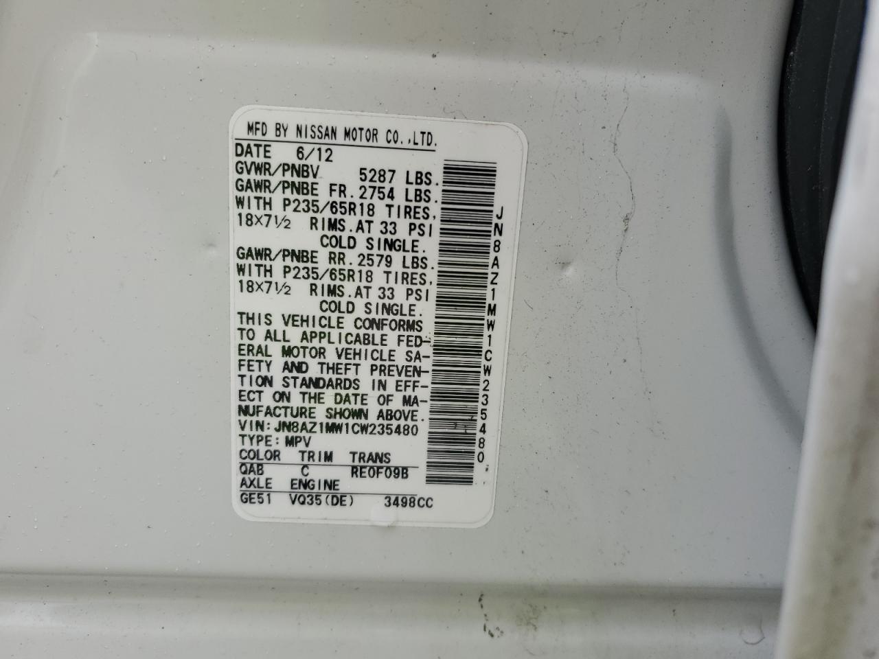 Колір БілийЦиліндри 6Привід Повний привідVIN JN8AZ1MW1CW235480Стан Заводиться та їде (перевірено)Ушкодження Передня або задняДата аукціону 2025-11-06