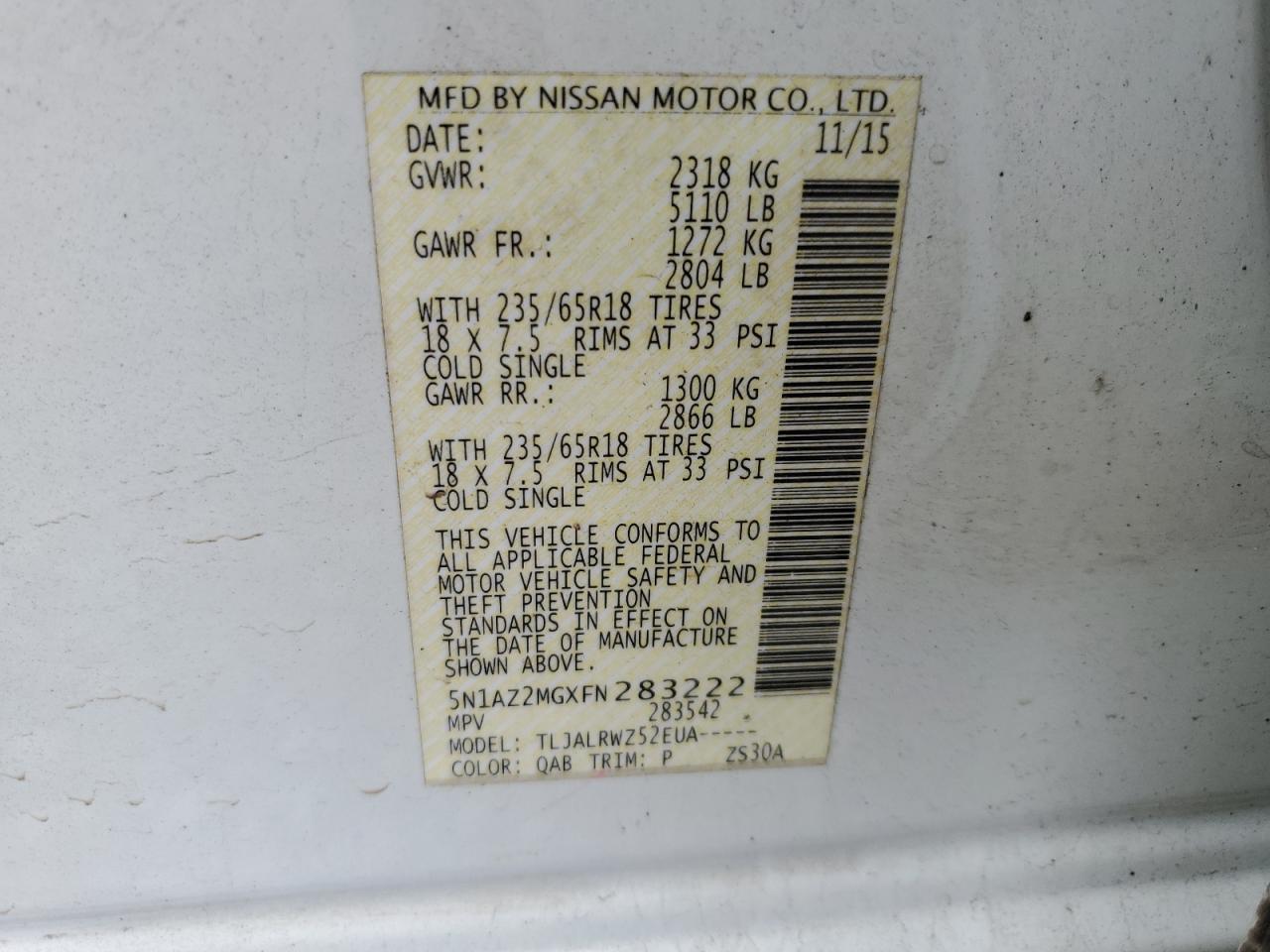 Колір БілийЦиліндри 6VIN 5N1AZ2MGXFN283222Стан Заводиться та їде (перевірено)Ушкодження Звичайний зносДата аукціону 2025-11-06