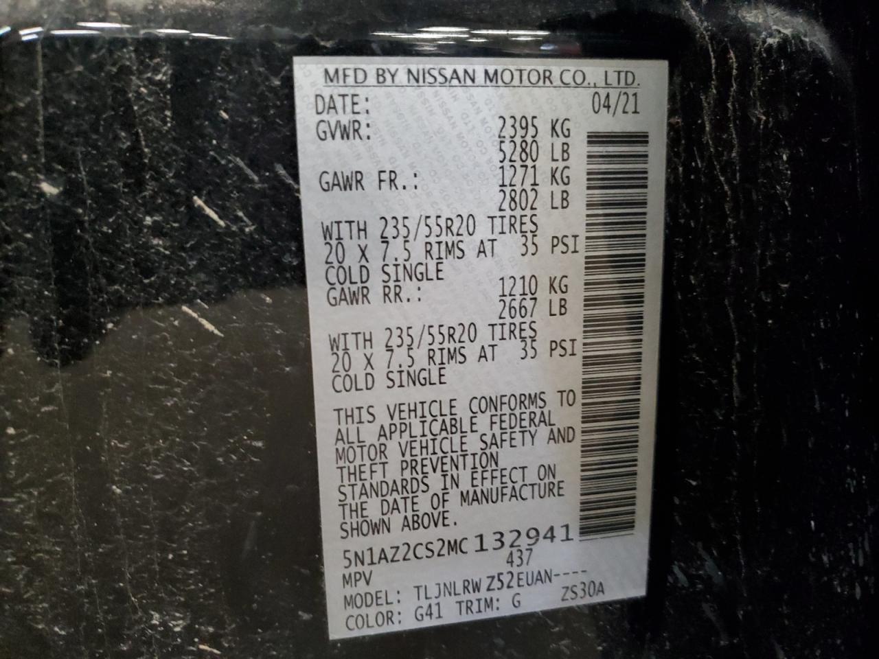 Колір ЧорнийЦиліндри 6Привід Повний привідVIN 5N1AZ2CS2MC132941Стан Заводиться та їде (перевірено)Ушкодження Передня або задняДата аукціону 2025-11-04