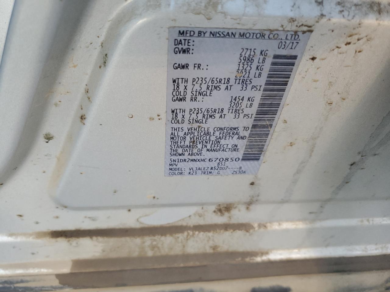 Колір СрібнийЦиліндри 6VIN 5N1DR2MNXHC670850Стан ЗаводитьсяУшкодження Передня або задня