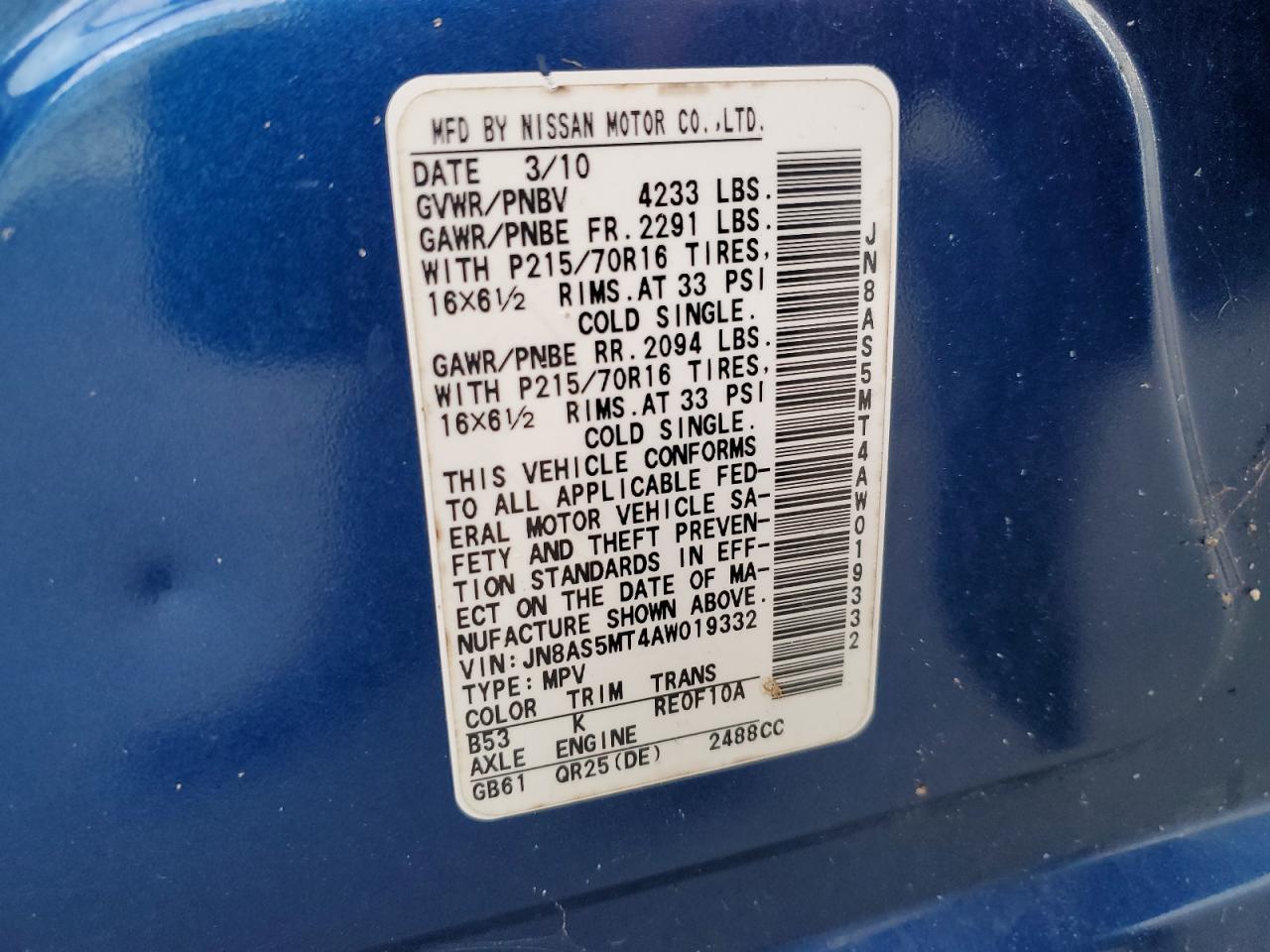 Колір СинійЦиліндри 4VIN JN8AS5MT4AW019332Стан Заводиться та їде (перевірено)Ушкодження Механічні пошкодженняДата аукціону 2025-11-05
