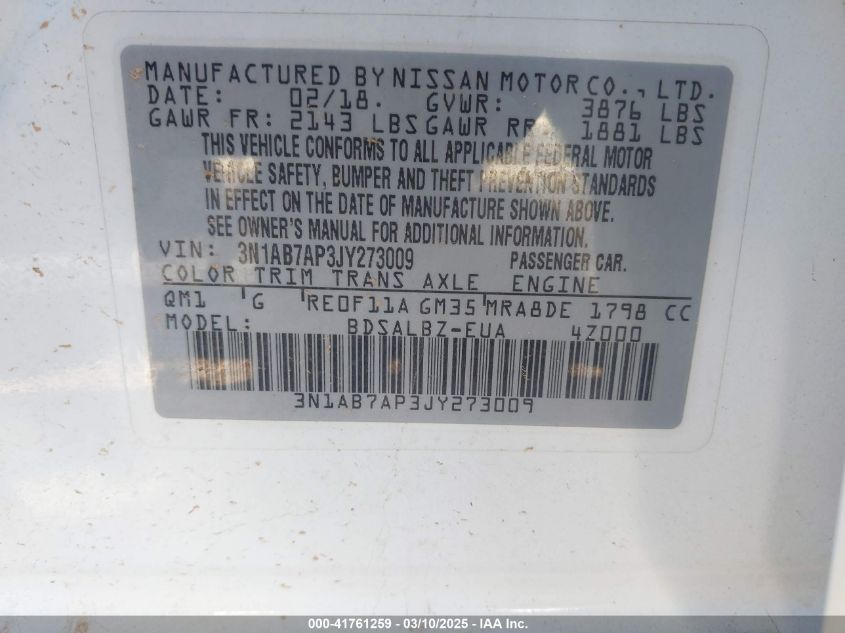 NISSAN SENTRA 1.8 2018 р.в., Передній привід (3N1AB7AP3JY273009) з США
