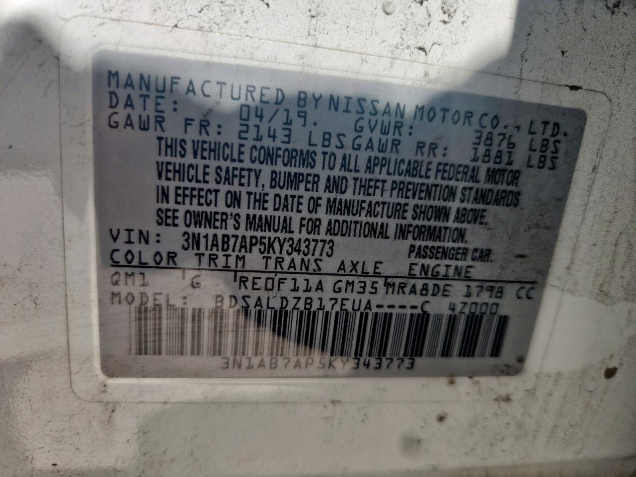 Колір БілийЦиліндри 4VIN 3N1AB7AP5KY343773Стан Заводиться та їде (перевірено)Ушкодження Передня або задняДата аукціону 2025-11-03