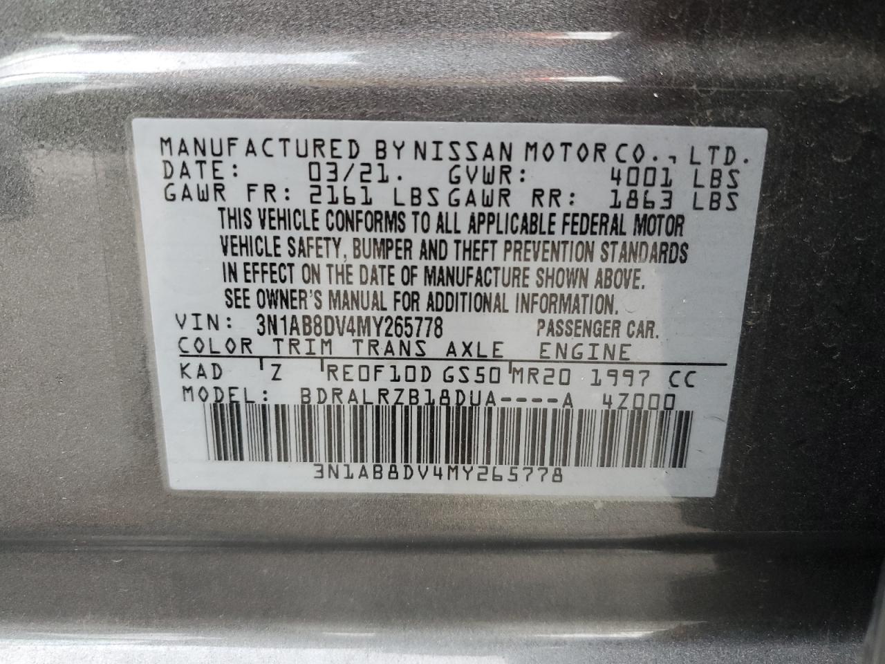 Колір СірийЦиліндри 4VIN 3N1AB8DV4MY265778Стан Заводиться та їде (перевірено)Ушкодження Передня або задняДата аукціону 2025-11-03