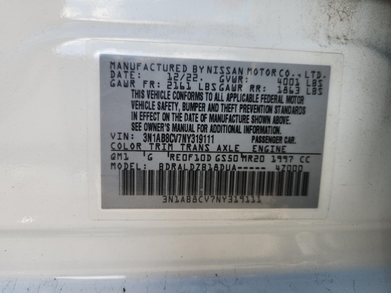 NISSAN SENTRA 2.0 2022 р.в., (3N1AB8CV7NY319111) з США