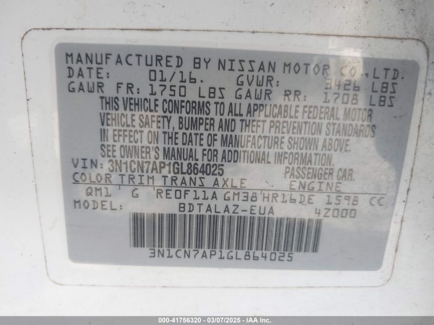 2016 NISSAN VERSA 1.6 S/1.6 S+/1.6 SL/1.6 SV