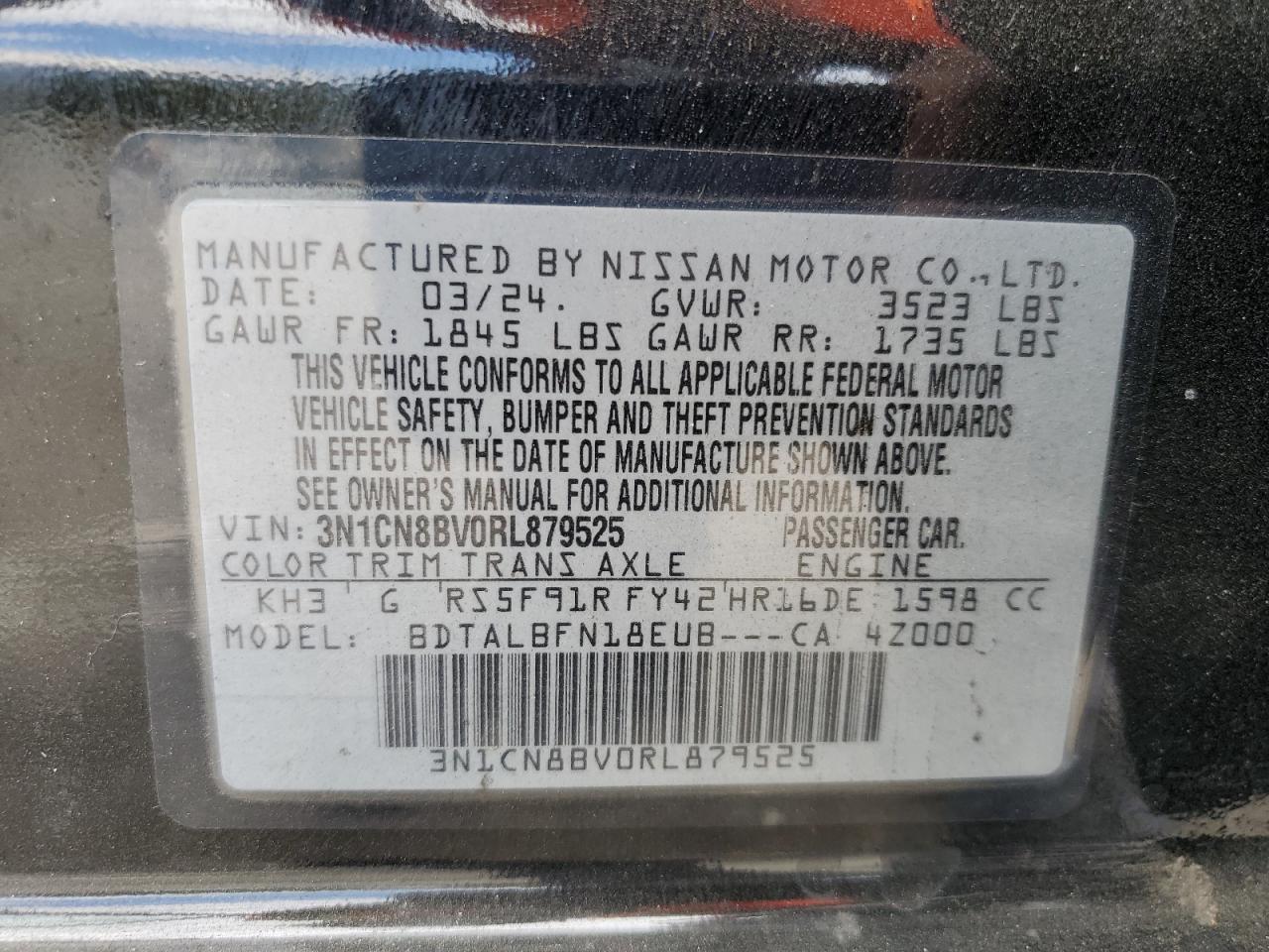 Колір ЧорнийЦиліндри 4VIN 3N1CN8BV0RL879525Стан Заводиться та їде (перевірено)Ушкодження ЗадняДата аукціону 2025-11-04