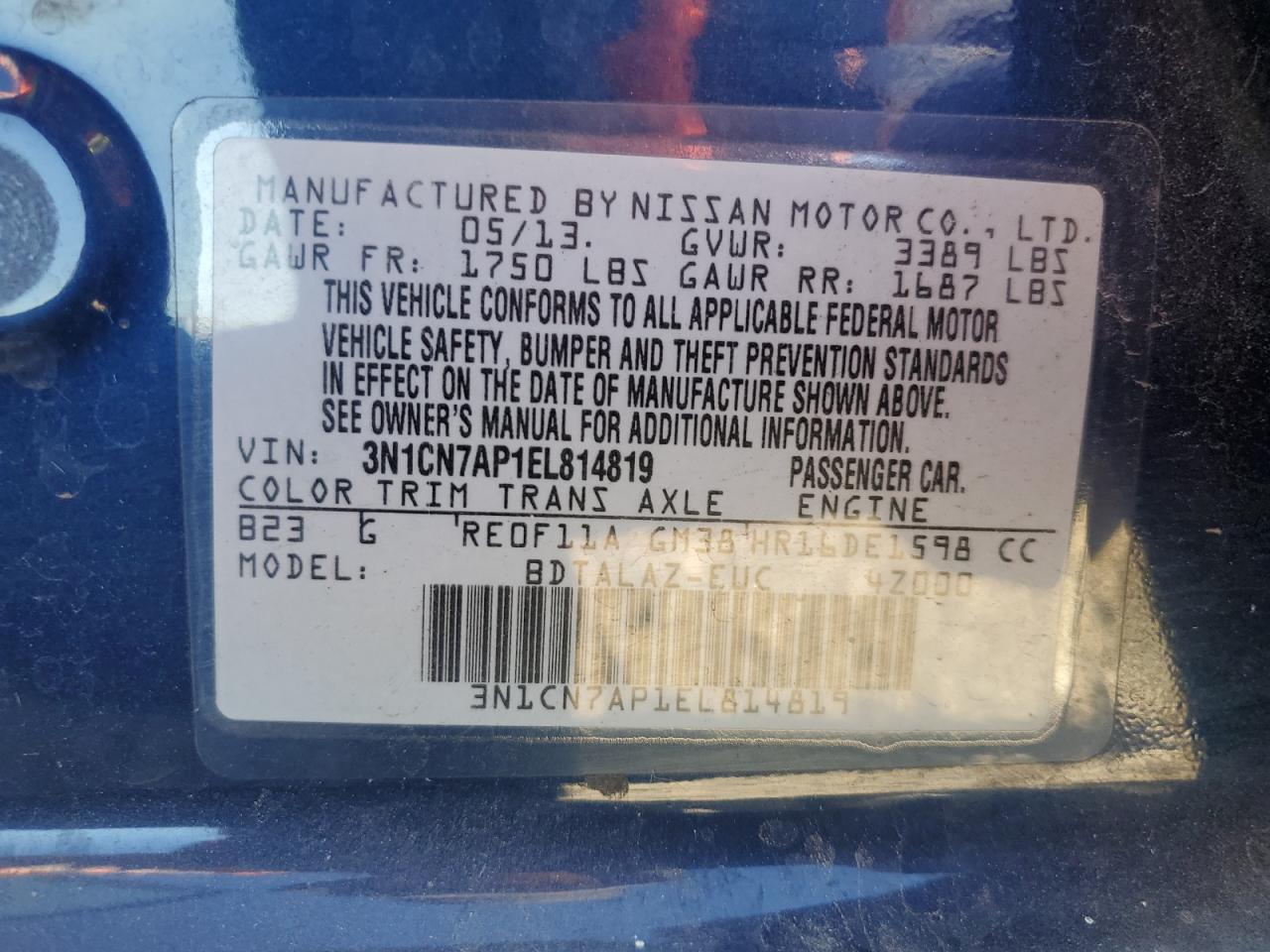 Колір СинійЦиліндри 4VIN 3N1CN7AP1EL814819Стан Заводиться та їде (перевірено)Ушкодження Передня або задняДата аукціону 2025-11-04