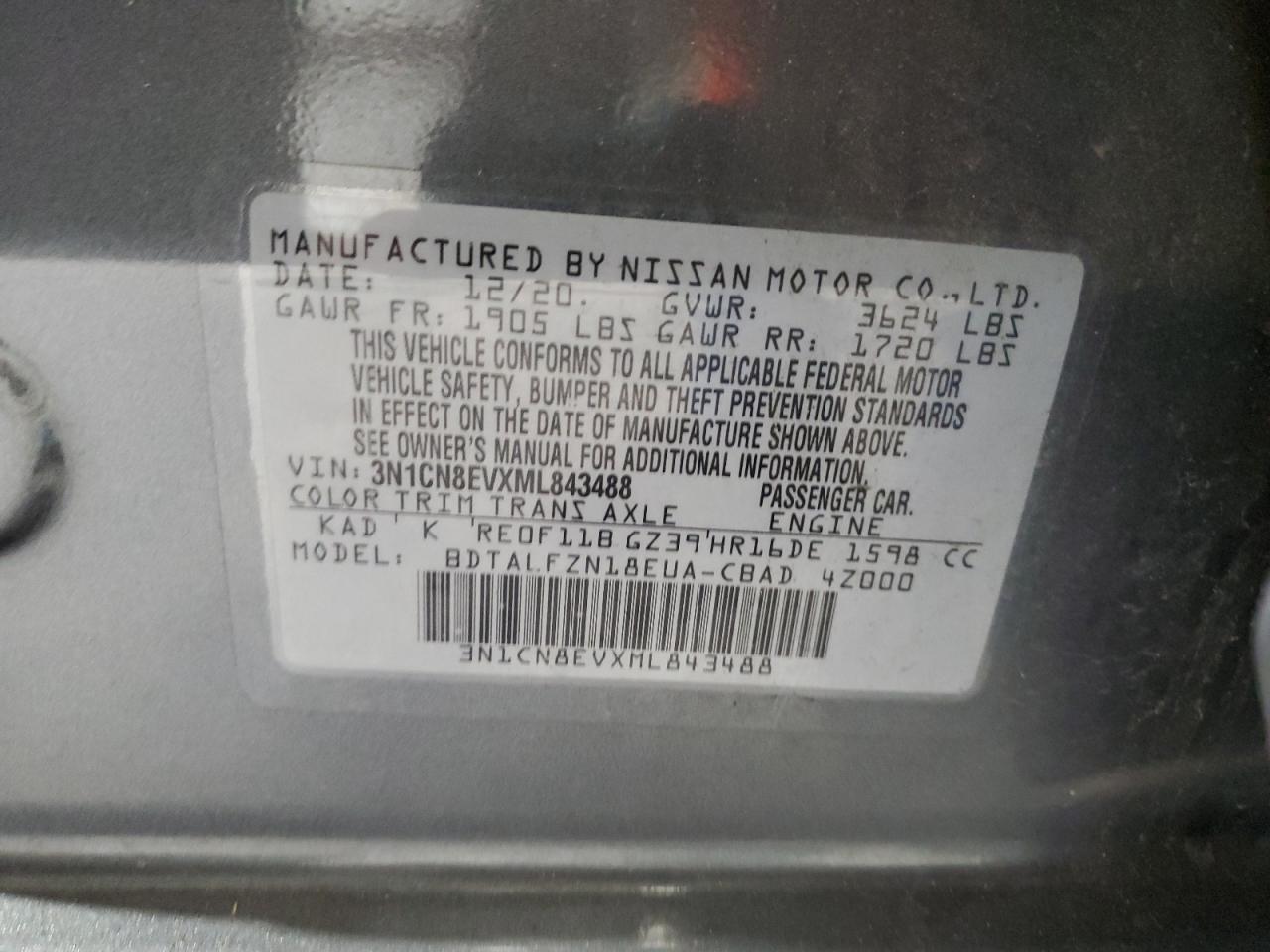 Колір Деревне вугілляЦиліндри 4VIN 3N1CN8EVXML843488Стан Заводиться та їде (перевірено)Ушкодження Передня або задняДата аукціону 2025-11-05
