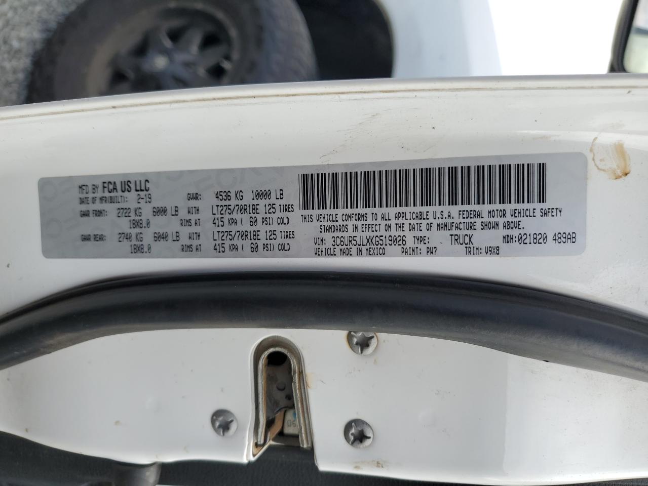 Колір БілийЦиліндри 6Привід 4x4 з заднім приводомVIN 3C6UR5JLXKG519026Стан Заводиться та їде (перевірено)Ушкодження ПерекиданняДата аукціону 2025-11-04