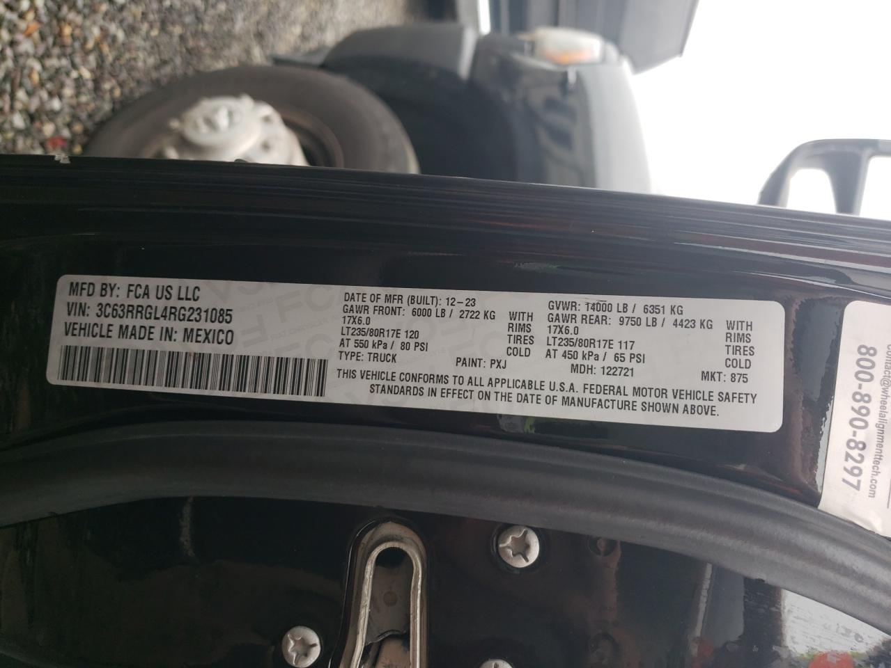 Колір ЧорнийЦиліндри 6Привід 4x4 з заднім приводомVIN 3C63RRGL4RG231085Стан Заводиться та їде (перевірено)Ушкодження НезначніДата аукціону 2025-11-13