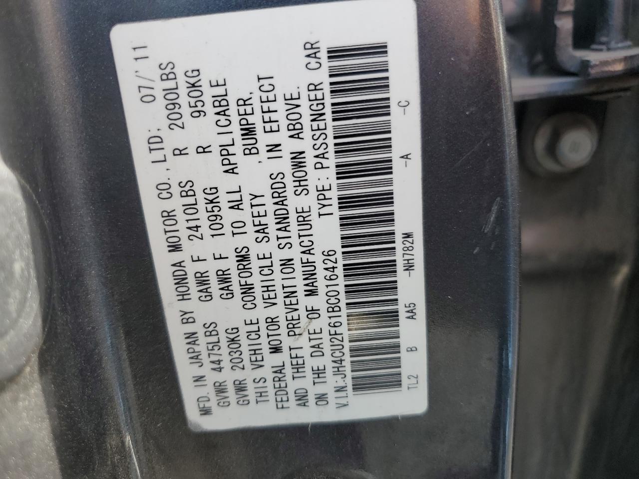 Цвет Древесный угольЦилиндры 4VIN JH4CU2F61BC016426Состояние НеизвестноПовреждение Передняя или задняя