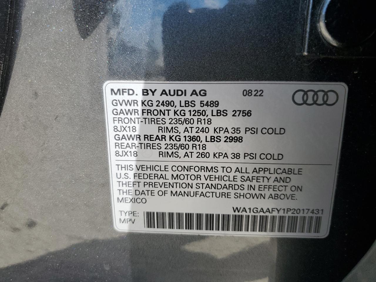 Цвет СерыйЦилиндры 4Привод Полный приводVIN WA1GAAFY1P2017431Состояние НеизвестноПовреждение Передняя или задняяДата аукциона 2025-11-07