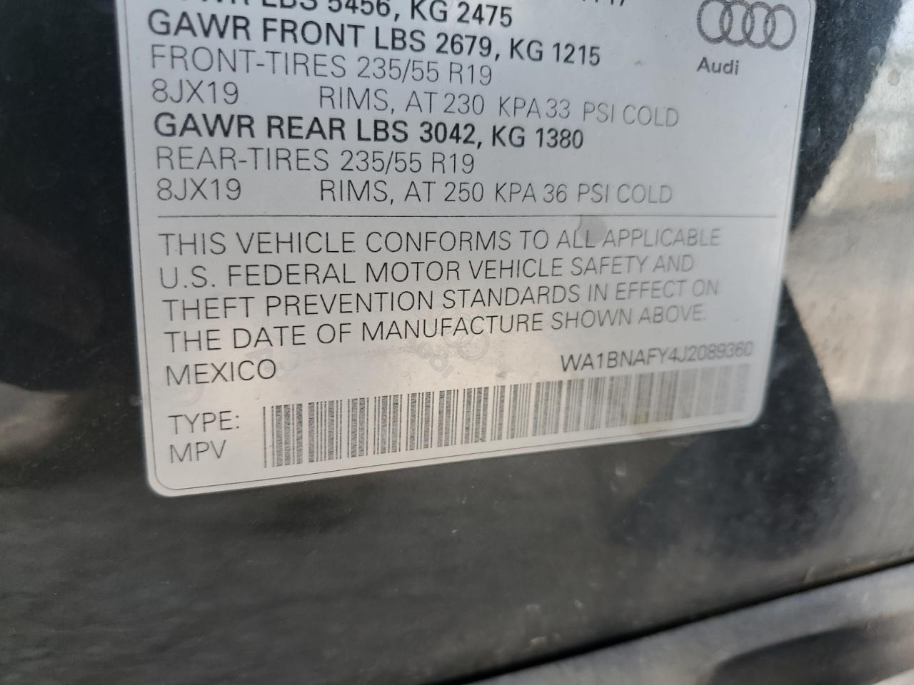 Цвет СерыйЦилиндры 4Привод Полный приводVIN WA1BNAFY4J2089360Состояние НеизвестноПовреждение По бокамДата аукциона 2025-11-04
