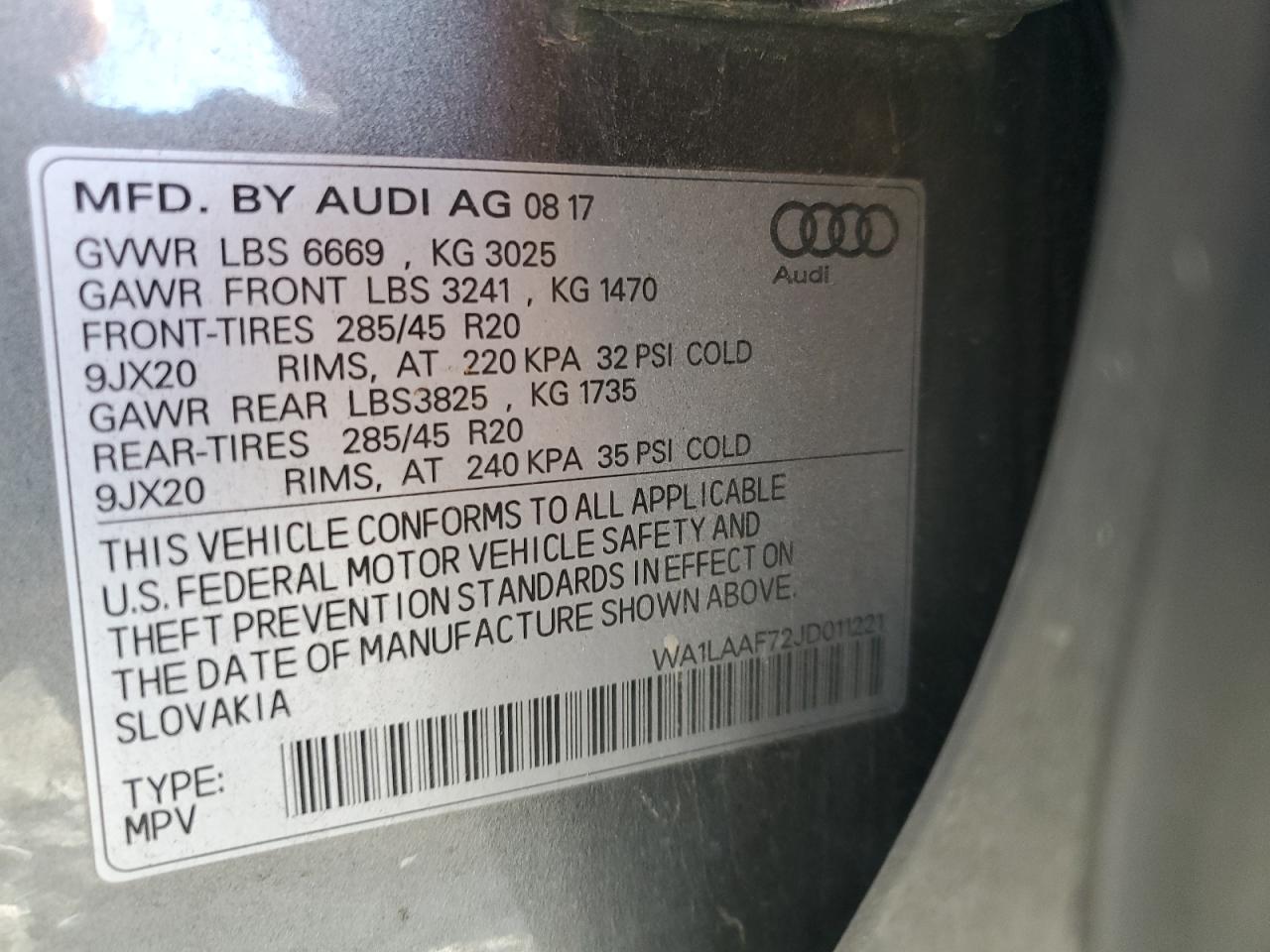 Цвет СерыйЦилиндры 6Привод Полный приводVIN WA1LAAF72JD011221Состояние Заводится и едет (проверено)Повреждение Передняя или задняя