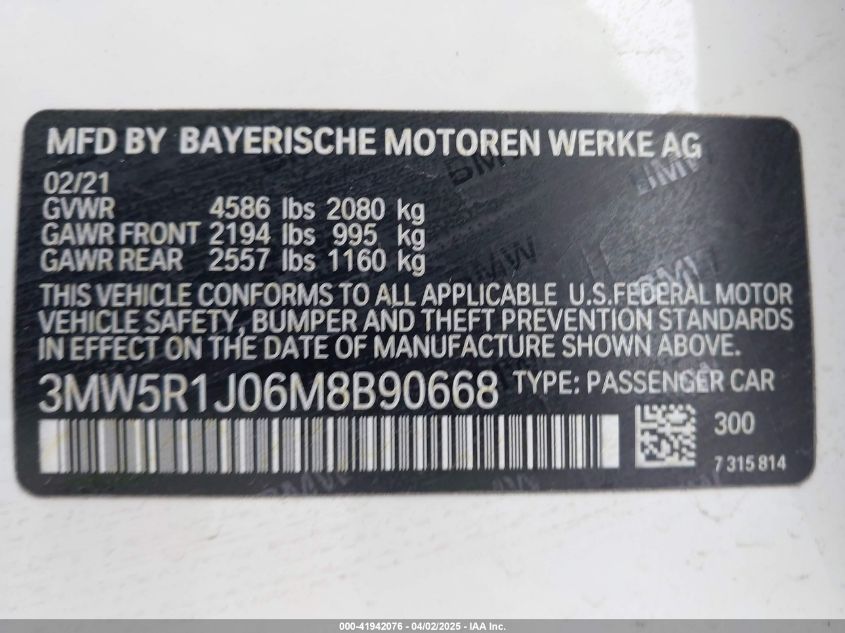 BMW 3 SERIES 2.0 2021 г.в., Задний привод (3MW5R1J06M8B90668) из США