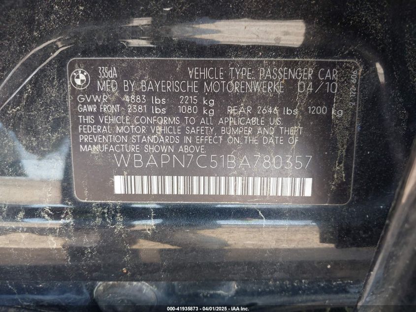 BMW 3 SERIES 3.0 2011 г.в., Задний привод (WBAPN7C51BA780357) из США