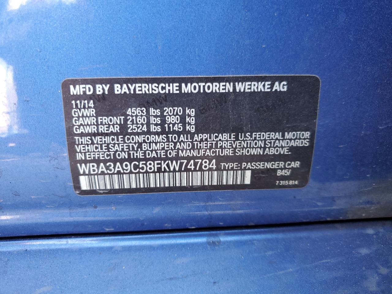 BMW 3 SERIES 3.0 2015 г.в., Задний привод (WBA3A9C58FKW74784) из США
