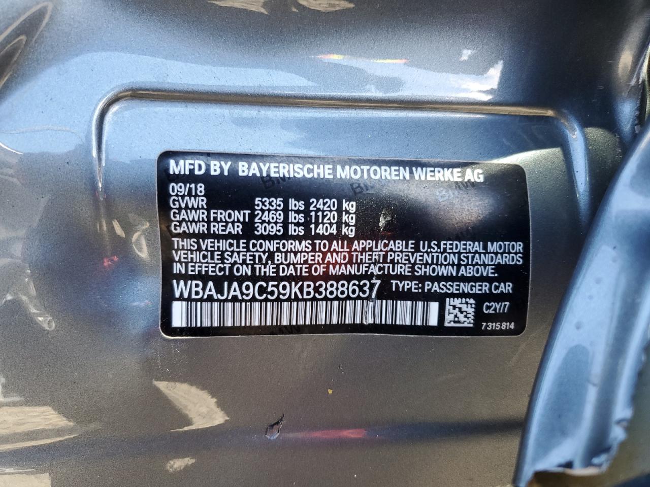 BMW 5 SERIES 2.0 2019 г.в., Задний привод (WBAJA9C59KB388637) из США