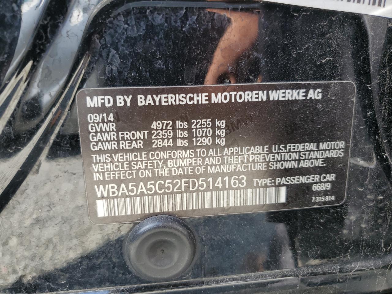BMW 5 SERIES 2.0 2015 г.в., Задний привод (WBA5A5C52FD514163) из США