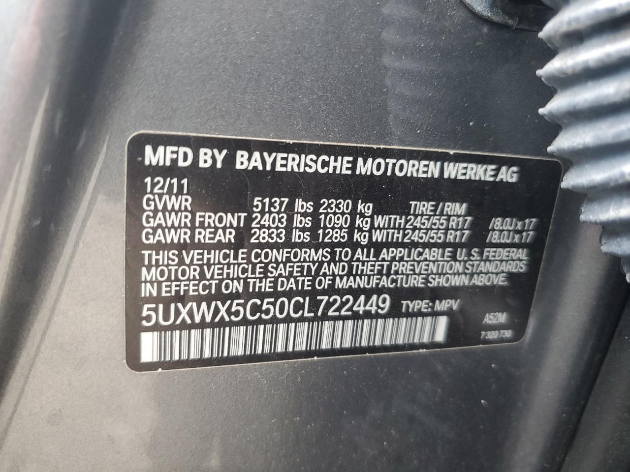 BMW X3 3.0 2012 г.в., Полный привод (5UXWX5C50CL722449) из США