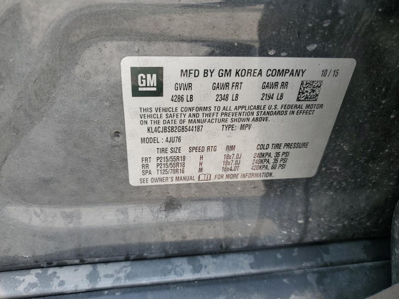 Цвет Древесный угольЦилиндры 4VIN KL4CJBSB2GB544187Состояние НеизвестноПовреждение Передняя или задняя